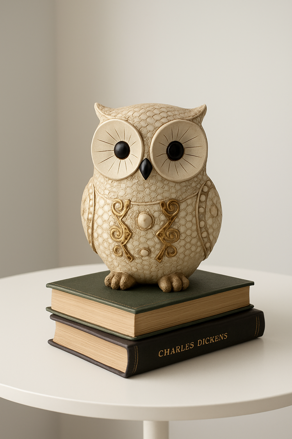 Trabalhada em forma de coruja, esta estátua associada a sabedoria, adicionando charme significativo a qualquer espaço